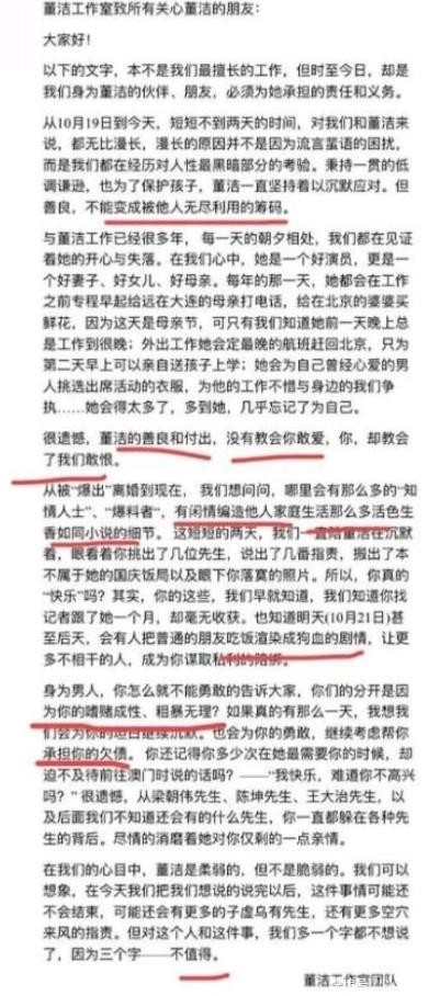 10�日,董洁工作室发布千余字声明,措辞激烈如檄文,将潘粤明推至舆论风暴中心。文中罗列其“沉迷赌博、言行失当、疏于家庭责任”等数项指控,极力塑造自身为隐忍受害者的形象。